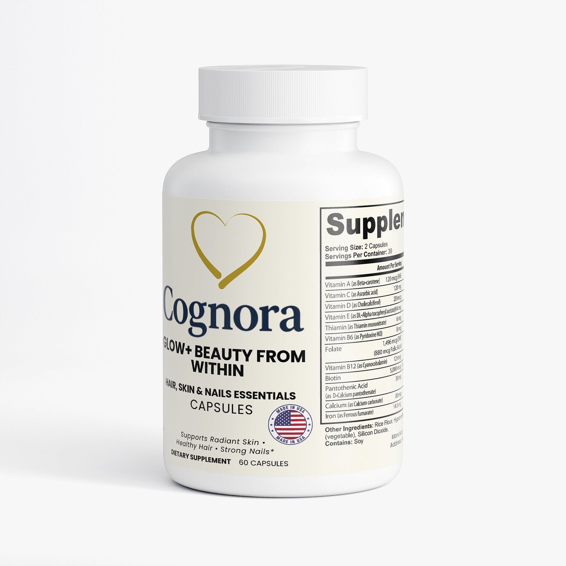 Cognora Glow+ Hair, Skin & Nails Essentials is a nutrient-rich daily formula designed to nourish your beauty from the inside out. A blend of vitamins A, C, D, E, and B-complex nutrients works synergistically with biotin, folate, and elastin-supporting minerals to promote glowing skin, stronger nails, and thicker, more resilient hair.